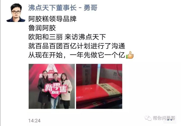 据悉,今天已经有阿胶领域领先品牌鲁润阿胶的代表前来沸点天下谈百品百团百亿计划的合作了;也有很多品牌正在沟通中,如果你身边有好品牌,也想进入新零售欢迎推荐。